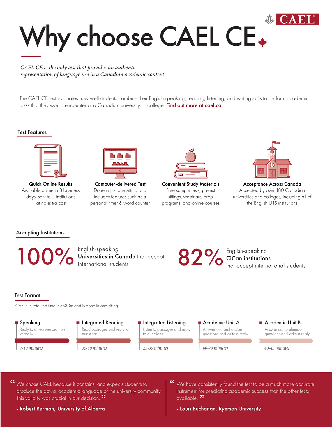 CAEL is one of the best tools for identifying students with the right English skills for academic success. It provides an authentic representation of language use in a Canadian academic context. Test takers read articles, listen to a lecture, answer questions, and write a short essay, as they would be expected to do in a Canadian university or college classroom.